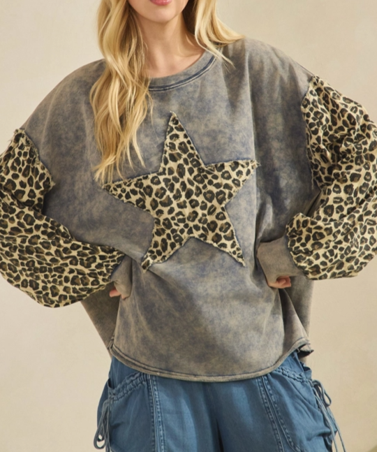 Wild Star Denim Leopard Long SLv Pullover Top ST7995